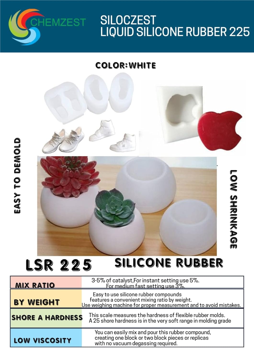 SILOCZEST LSR225 (Brushing Grade) Liquid Silicone Rubber is a high-quality, fast-curing material designed for use in resin art, craft, POP, and clay mold making applications. This particular variant, LSR-225, is a fast-curing formula that allows for quick mold creation and production. With excellent tear strength and elongation properties, SILOCZEST LSR225 ensures durable and long-lasting molds that can withstand repeated use. Its liquid form makes it easy to pour and spread evenly over intricate or detailed molds, capturing fine details with precision. Whether you're a professional artist or a hobbyist, SILOCZEST LSR225 Liquid Silicone Rubber offers reliability and ease of use for all your mold making needs.